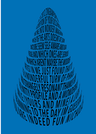 For each triptych, a single unanswered message is digitally manipulated into three unique sculptural forms and printed on individual sheets. Each twisting form obscures parts of the message, requiring the viewer to read across the three shaped texts to piece the message together. The red/green/blue surfaces underscore the digital origin of the messages.