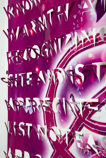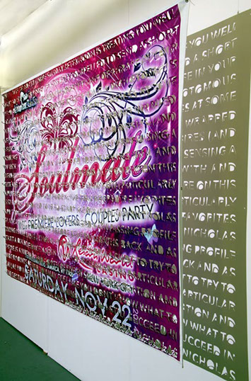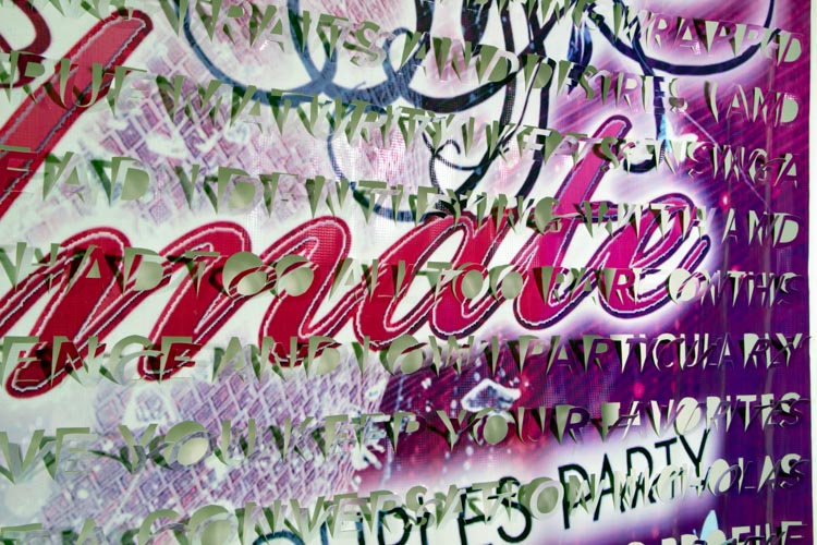 The printed banners are found objects advertising Rap, Reggae, Bollywood or other events, often with a dense pastiche of typography and a medley of artist faces printed on the surface. A ‘more is more’ aesthetic guides the designs, with vast quantities of information offered, far more than could be consumed by the passing motorists who constitute the primary audience. The dating messages are then cut into the material in dense blocks, forming a screen over the imagery. All the texts and images remain visible, but the holes and dangling letter-forms disrupt the ability to easily read or interpret any element. Coherence breaks down and the surface buzzes and vibrates.