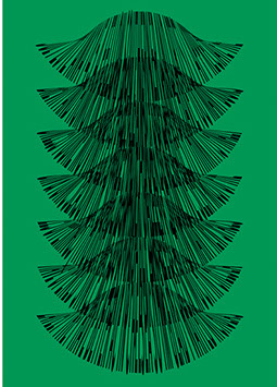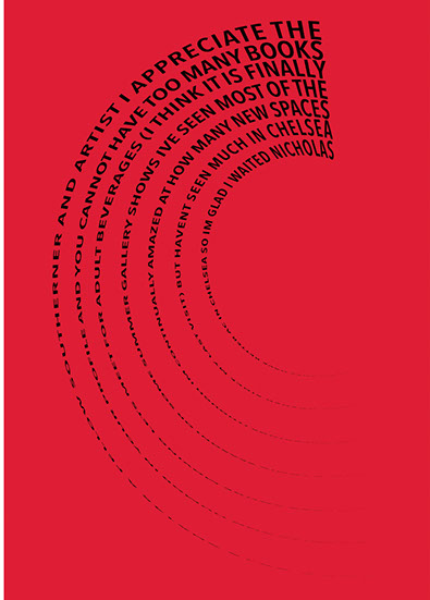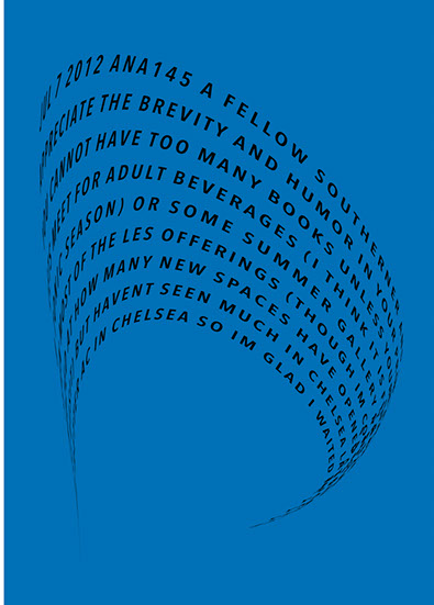 For each triptych, a single unanswered message is digitally manipulated into three unique sculptural forms and printed on individual sheets. Each twisting form obscures parts of the message, requiring the viewer to read across the three shaped texts to piece the message together. The red/green/blue surfaces underscore the digital origin of the messages.
