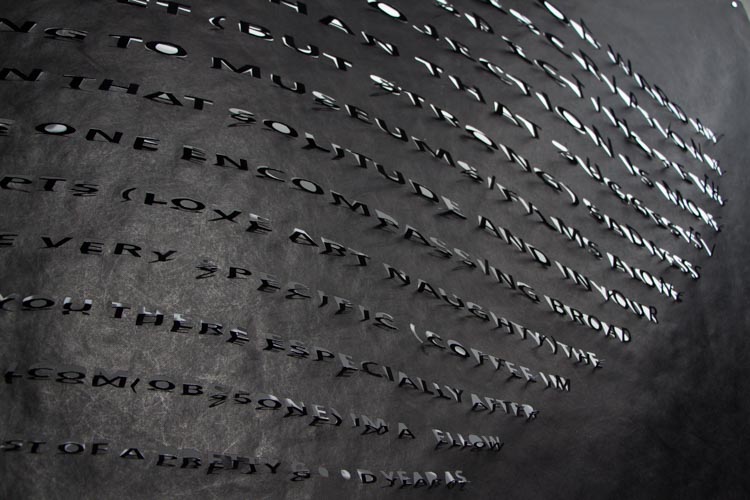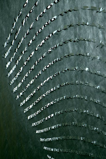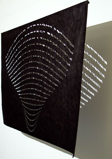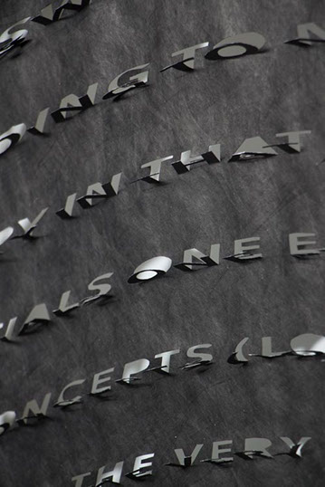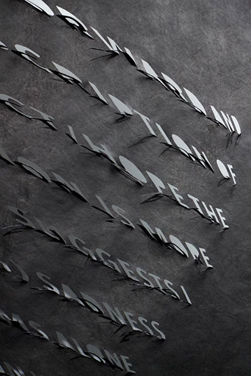 Thin and delicate, they are fastened only at the top, allowing the works to be responsive to the slightest breeze created by passing viewers. Individual letters flutter and shake, further activating the forms.