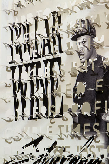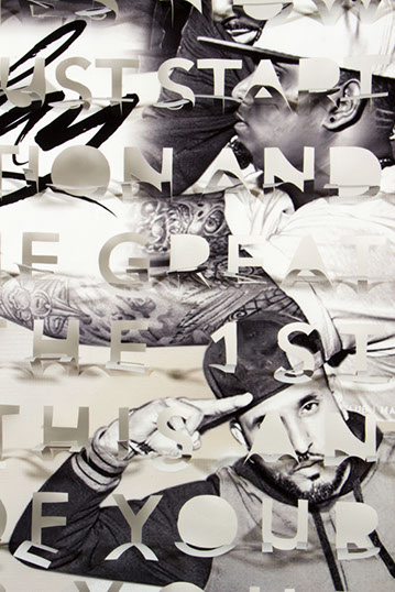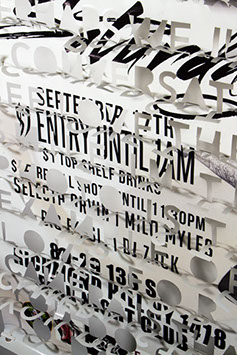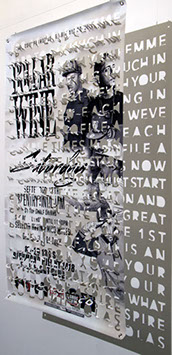 The printed banners are found objects advertising Rap, Reggae, Bollywood or other events, often with a dense pastiche of typography and a medley of artist faces printed on the surface. A ‘more is more’ aesthetic guides the designs, with vast quantities of information offered, far more than could be consumed by the passing motorists who constitute the primary audience. The dating messages are then cut into the material in dense blocks, forming a screen over the imagery. All the texts and images remain visible, but the holes and dangling letter-forms disrupt the ability to easily read or interpret any element. Coherence breaks down and the surface buzzes and vibrates.