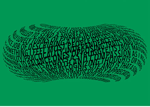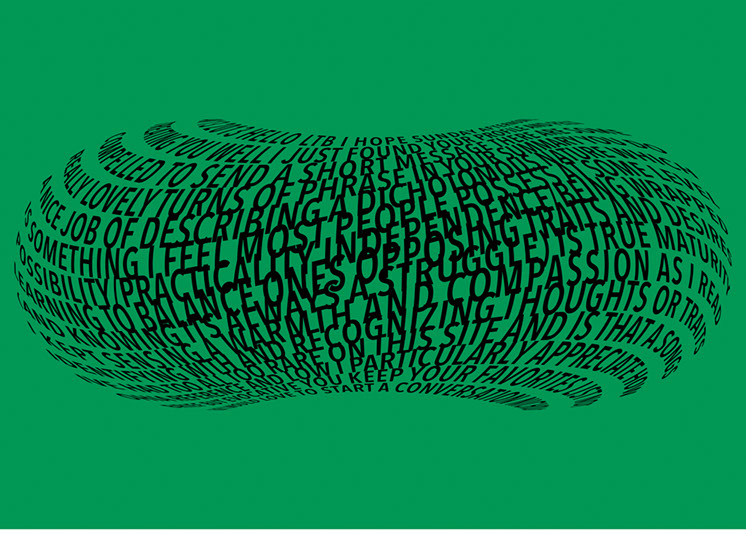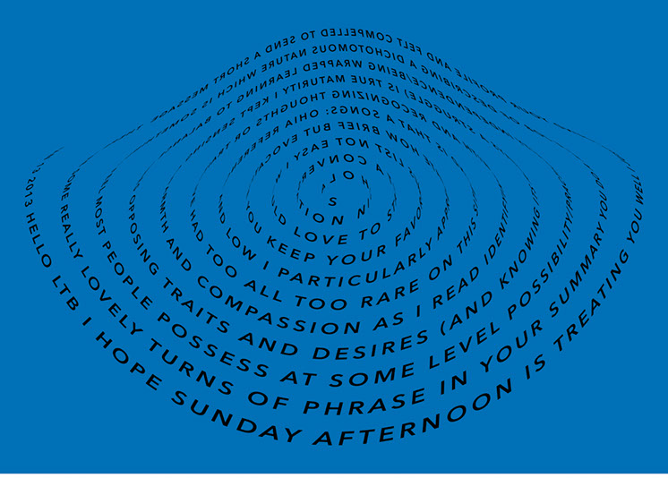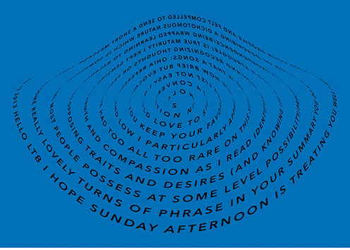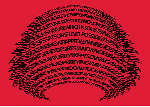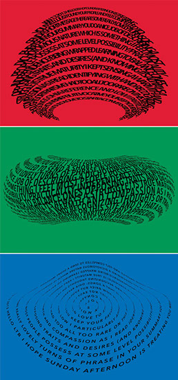 For each triptych, a single unanswered message is digitally manipulated into three unique sculptural forms and printed on individual sheets. Each twisting form obscures parts of the message, requiring the viewer to read across the three shaped texts to piece the message together. The red/green/blue surfaces underscore the digital origin of the messages.