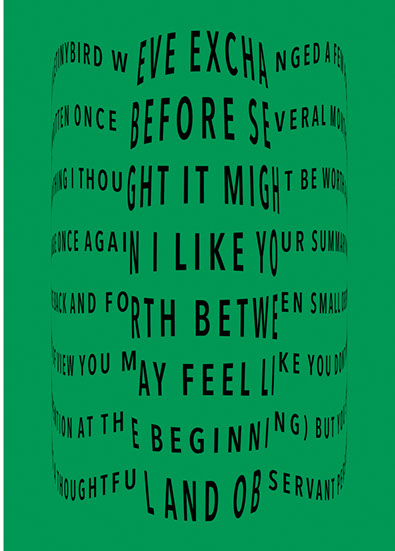 For each triptych, a single unanswered message is digitally manipulated into three unique sculptural forms and printed on individual sheets. Each twisting form obscures parts of the message, requiring the viewer to read across the three shaped texts to piece the message together. The red/green/blue surfaces underscore the digital origin of the messages.