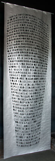 Warped and wrapped, the tyvek messages generate illusionistic shadow forms. The stretched letters echo the author’s initial efforts to shape the message for its intended recipient.