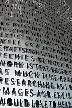 Thin and delicate and fastened only at the top, the viewer’s movements cause the material to ripple, individual letters to flutter and shake, further activating the forms.