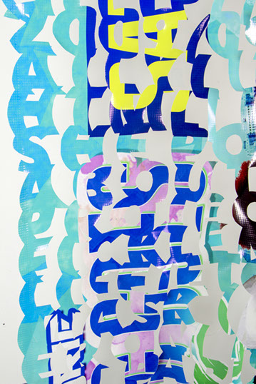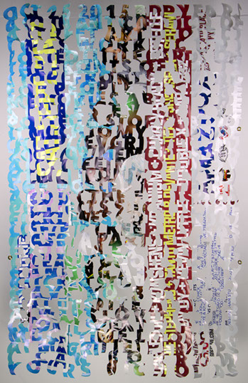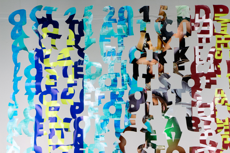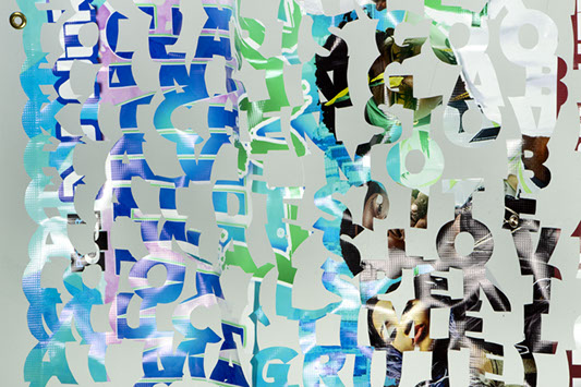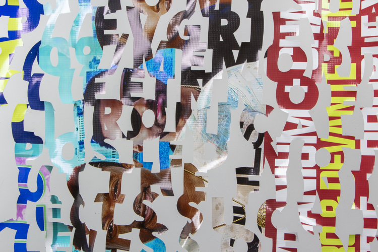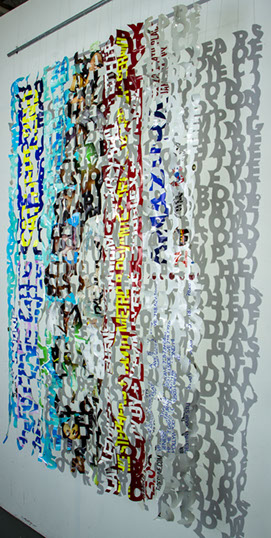 The printed banners are found objects advertising Rap, Reggae, Bollywood or other events, often with a dense pastiche of typography and a medley of artist faces printed on the surface. A ‘more is more’ aesthetic guides the designs, with vast quantities of information offered, far more than could be consumed by the passing motorists who constitute the primary audience. The dating messages are then cut into the material in dense blocks, forming a screen over the imagery. All the texts and images remain visible, but the holes and dangling letter-forms disrupt the ability to easily read or interpret any element. Coherence breaks down and the surface buzzes and vibrates.