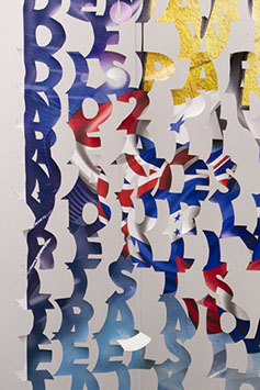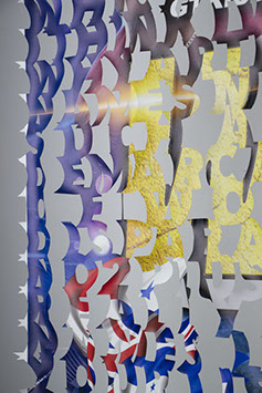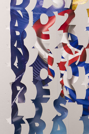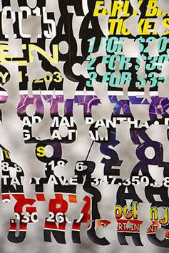 The printed banners are found objects advertising Rap, Reggae, Bollywood or other events, often with a dense pastiche of typography and a medley of artist faces printed on the surface. A ‘more is more’ aesthetic guides the designs, with vast quantities of information offered, far more than could be consumed by the passing motorists who constitute the primary audience. The dating messages are then cut into the material in dense blocks, forming a screen over the imagery. All the texts and images remain visible, but the holes and dangling letter-forms disrupt the ability to easily read or interpret any element. Coherence breaks down and the surface buzzes and vibrates.