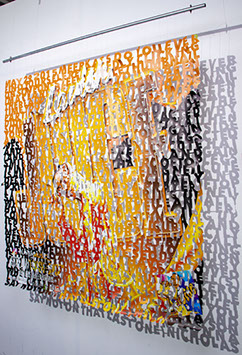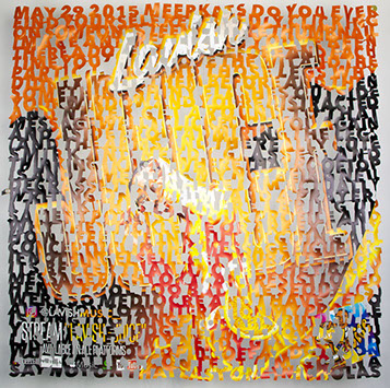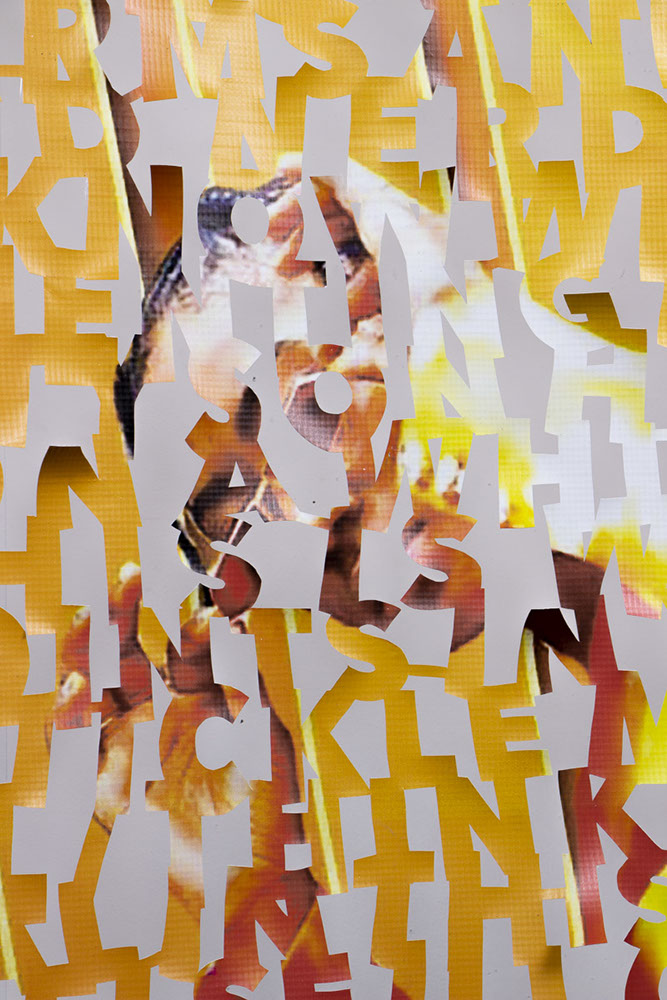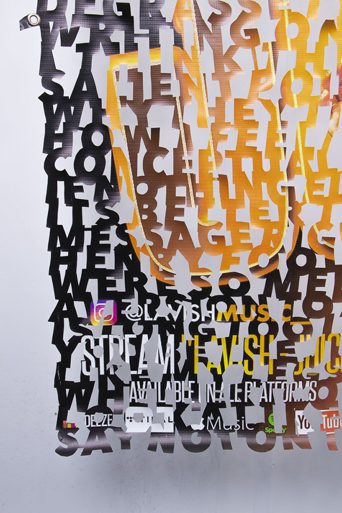 The printed banners are found objects advertising Rap, Reggae, Bollywood or other events, often with a dense pastiche of typography and a medley of artist faces printed on the surface. A ‘more is more’ aesthetic guides the designs, with vast quantities of information offered, far more than could be consumed by the passing motorists who constitute the primary audience. The dating messages are then cut into the material in dense blocks, forming a screen over the imagery. All the texts and images remain visible, but the holes and dangling letter-forms disrupt the ability to easily read or interpret any element. Coherence breaks down and the surface buzzes and vibrates.