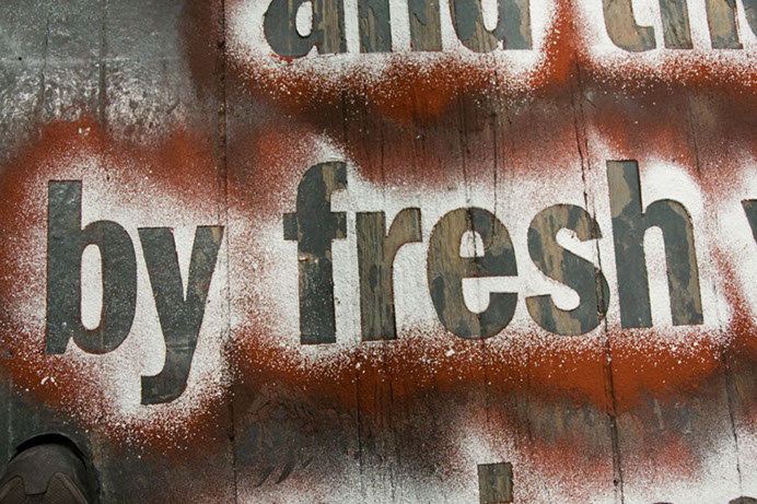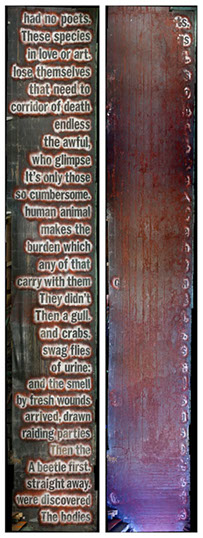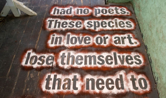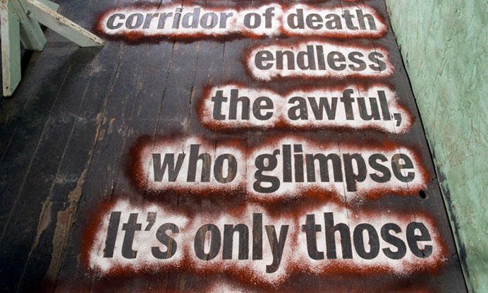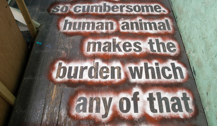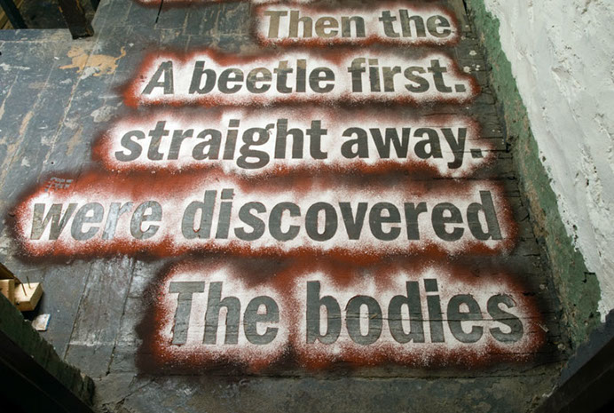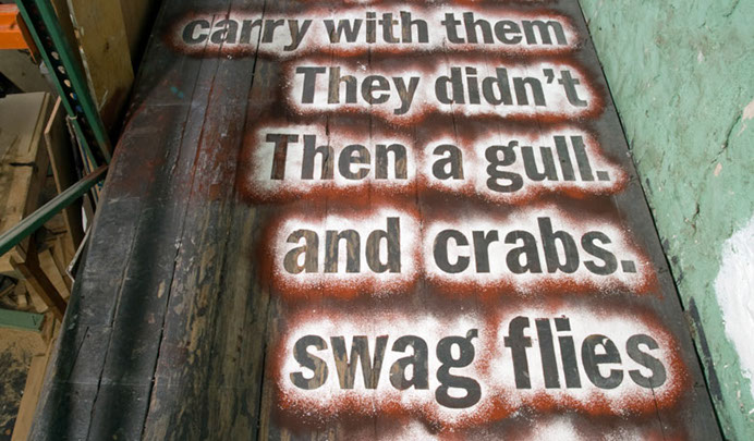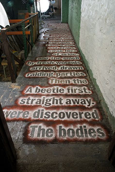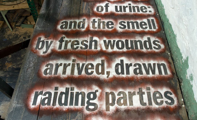 A multi-layered chalk powder text (reading from bottom to top) using passages from Jim Crace’s 1999 novel Being Dead.