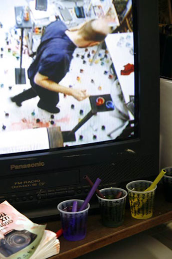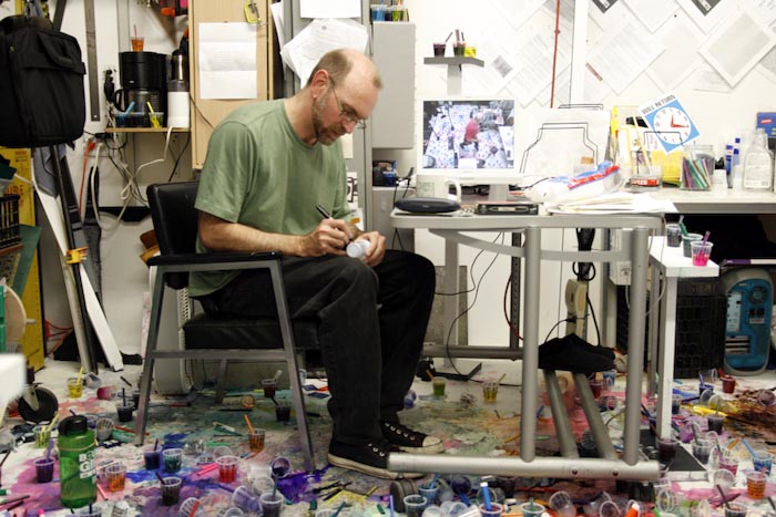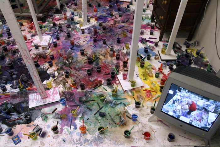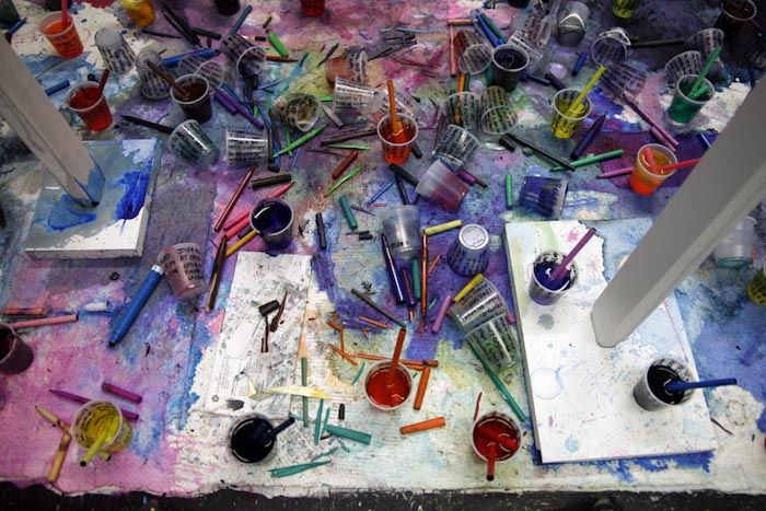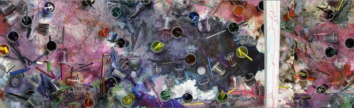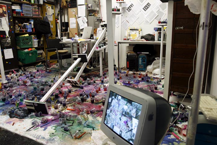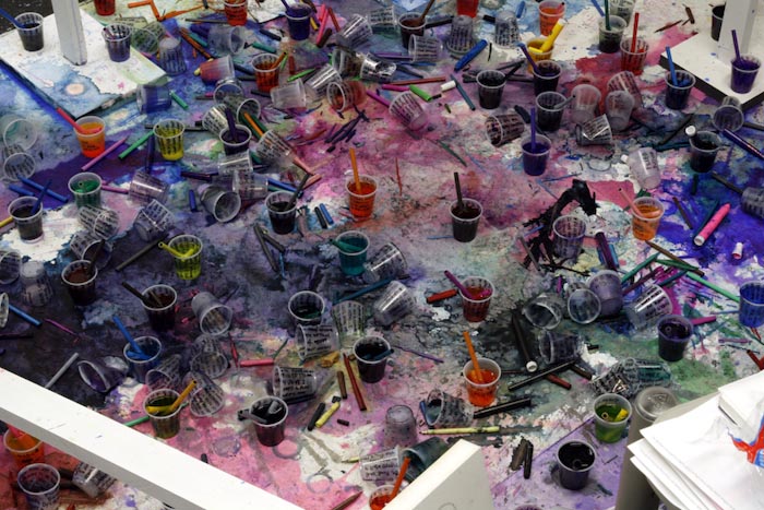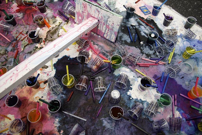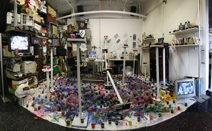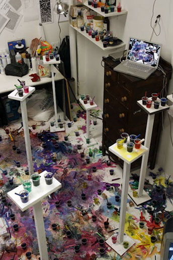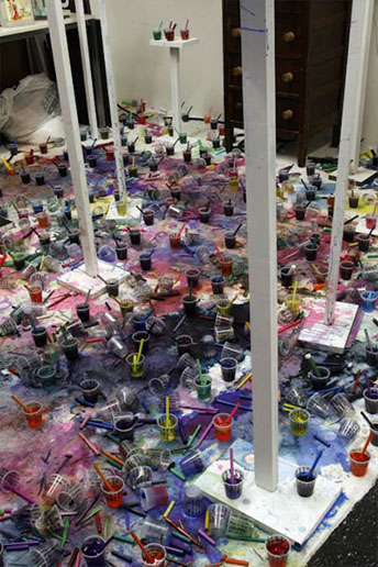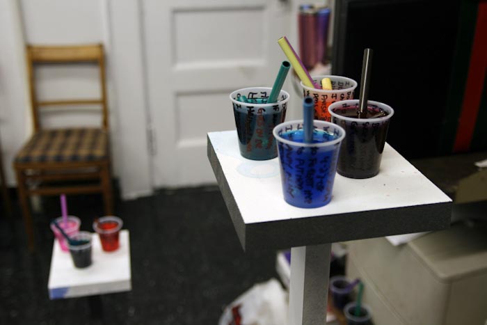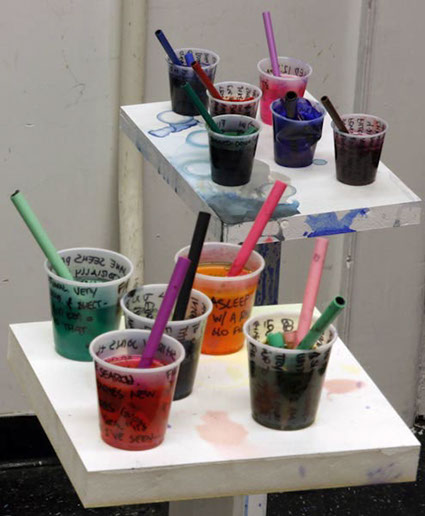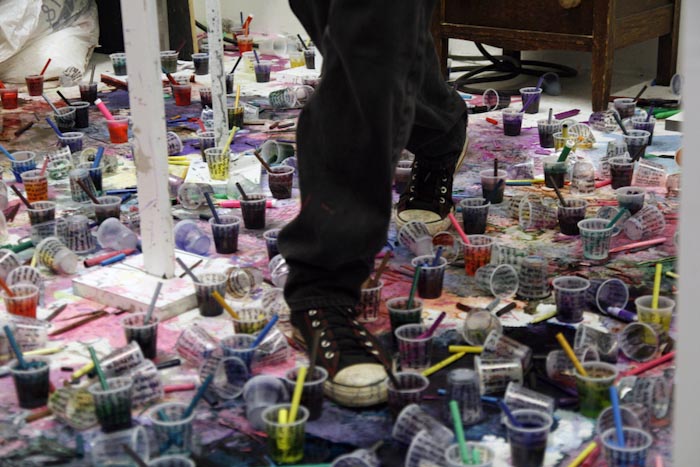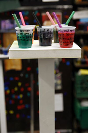 A working space is gradually filled with disposable plastic cups, each covered in hand-written diary entries. A performer fills each cup with colored water and distributes them on every horizontal surface in the studio. Navigating the space grows increasingly difficult and spills are frequent and inevitable. The performer persists regardless. The performance functions as both a low-tech blog and a painting system.