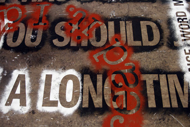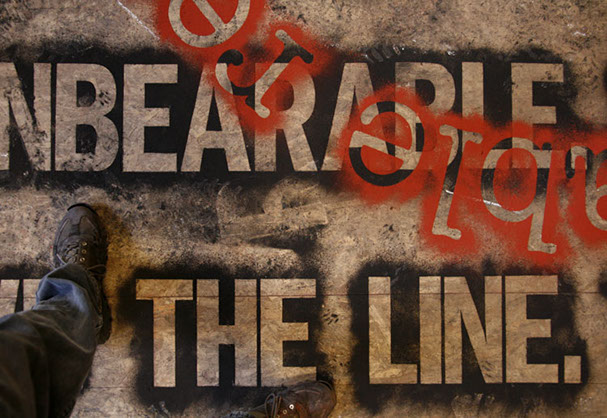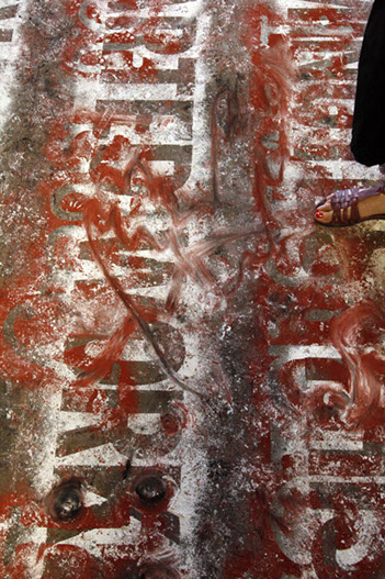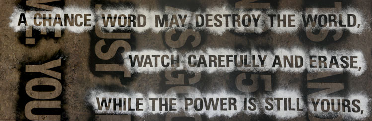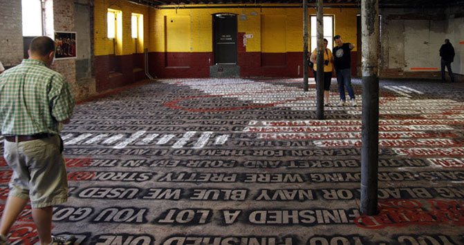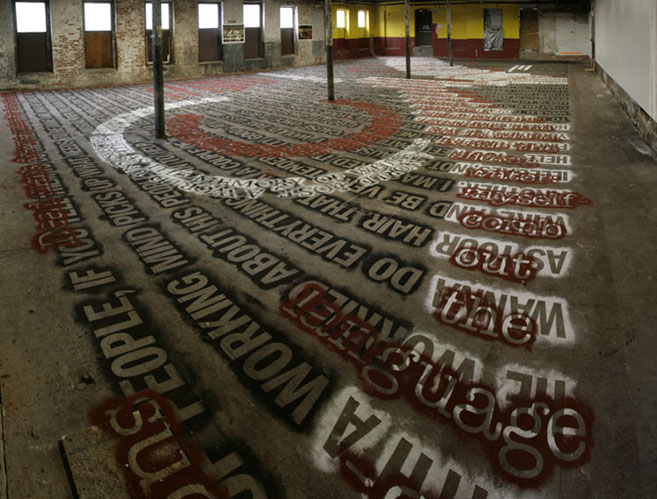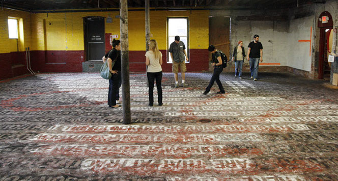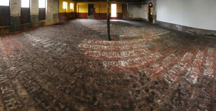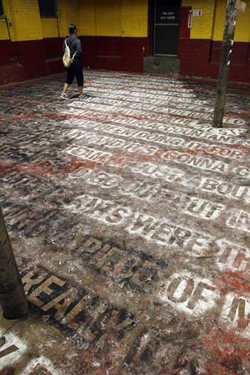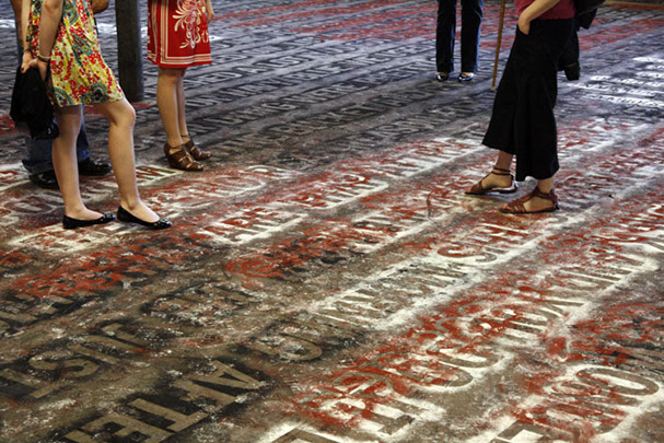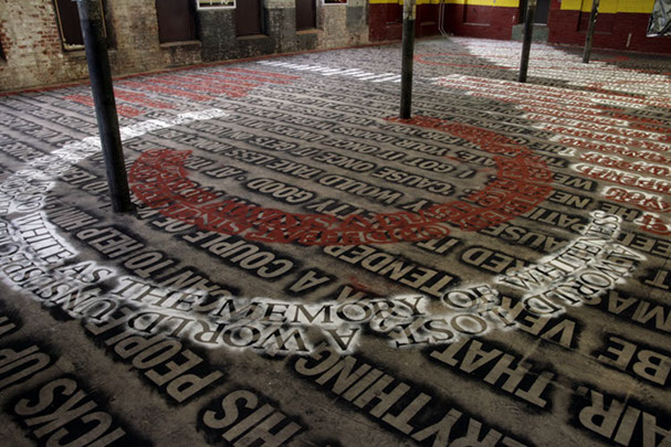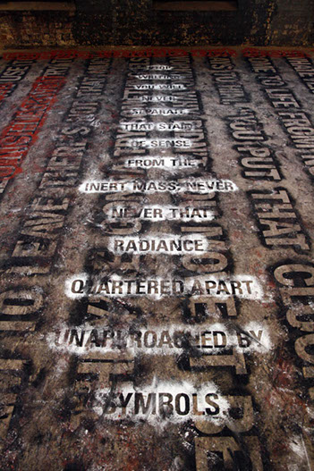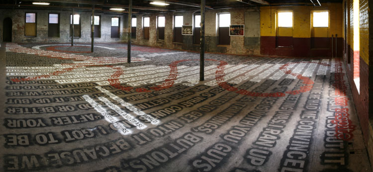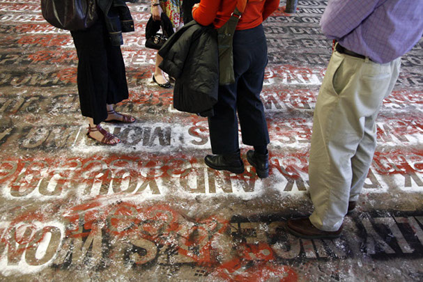 Both layers can only be closely examined or read by walking directly upon them. As a result, the texts slowly blur into one another and become illegible. The viewer is given final discretion to exercise editorial powers.