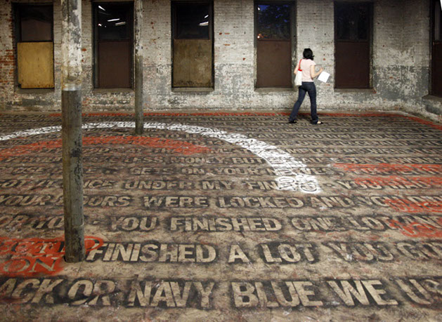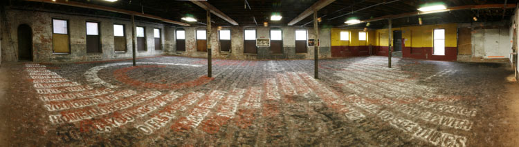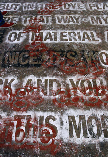 Two distinct texts overlapped on the floor of a defunct silk dying factory in Paterson, NJ.
