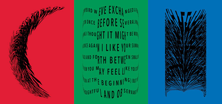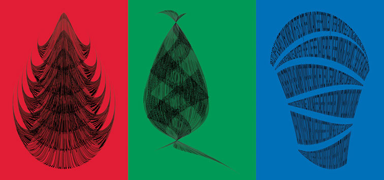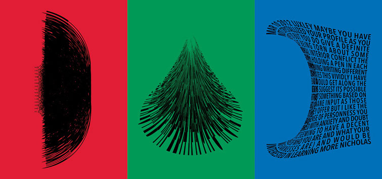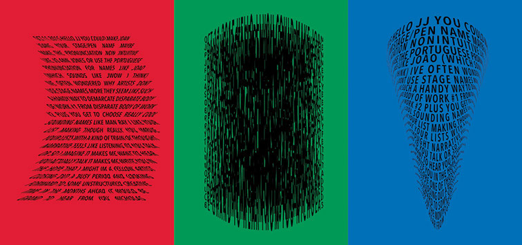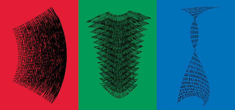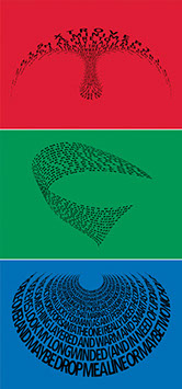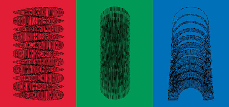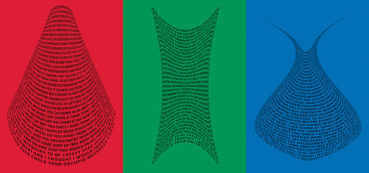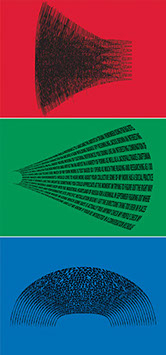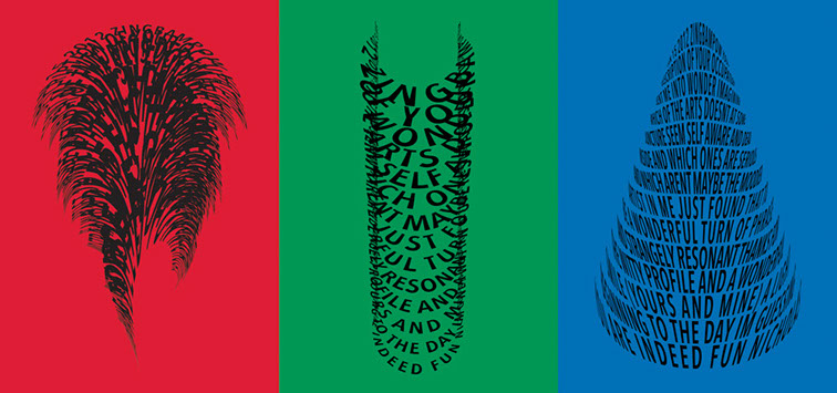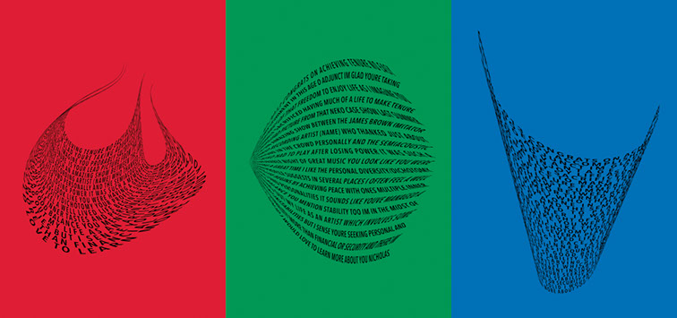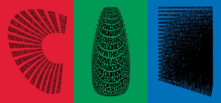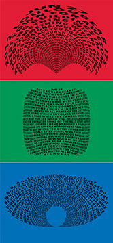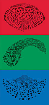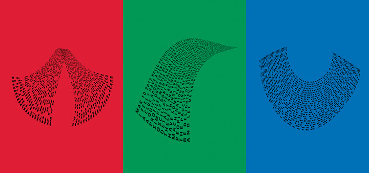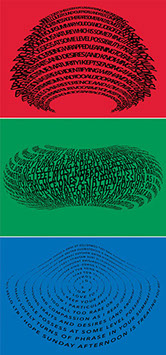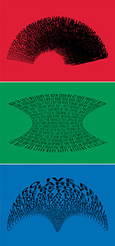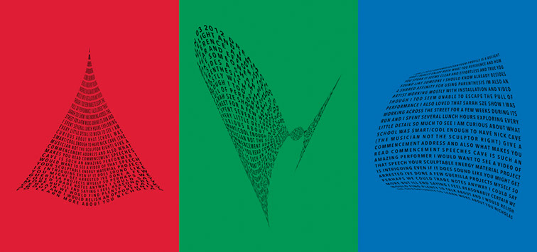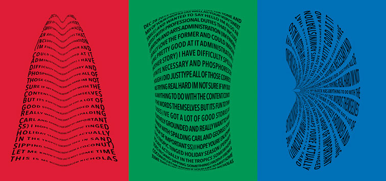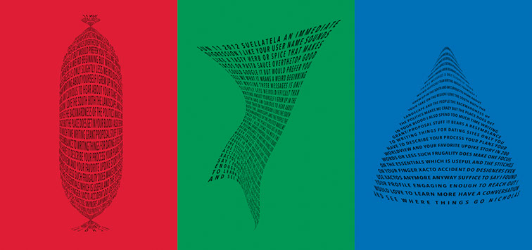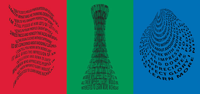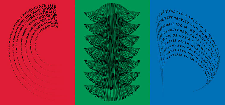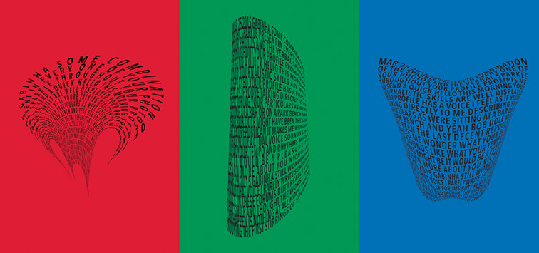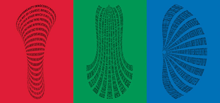 For each triptych, a single unanswered message is digitally manipulated into three unique sculptural forms and printed on individual sheets. Each twisting form obscures parts of the message, requiring the viewer to read across the three shaped texts to piece the message together. The red/green/blue surfaces underscore the digital origin of the messages.